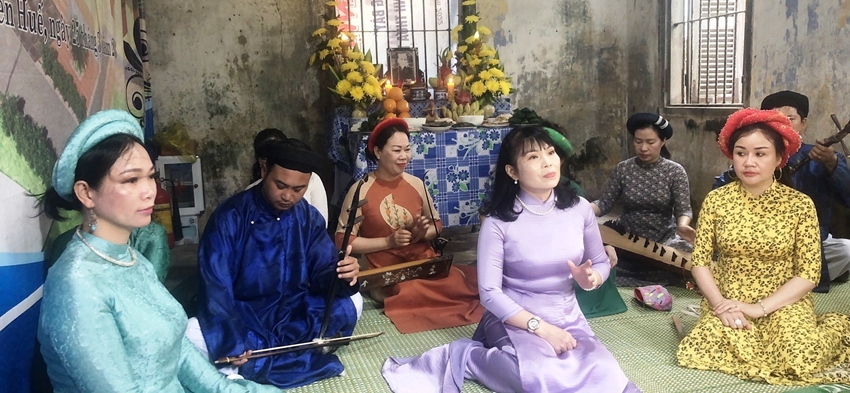 | Các nghệ sĩ biểu diễn Ca Huế tại Châu Hương Viên, kỉ niệm 62 năm ngày mất nhà thơ Ưng Bình. Ảnh: BTLS |