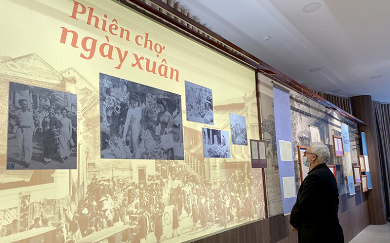 Một góc không gian triển lãm di sản tư liệu "Tết xưa" do Trung tâm Lưu trữ quốc gia I tổ chức. (Ảnh VY VY)