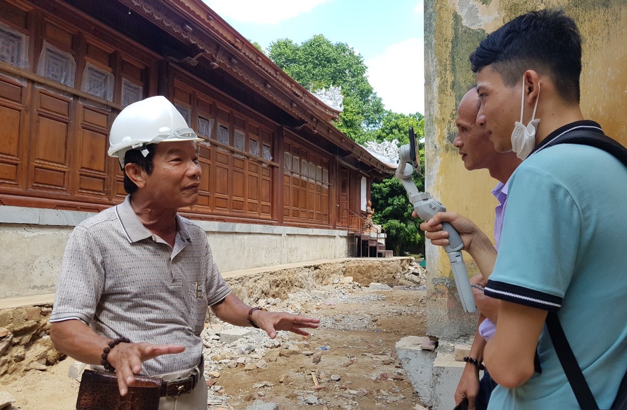 “Thần đèn” Nguyễn Văn Cư (trái) chia sẻ về quá trình dịch chuyển Quốc tự Diệu Đế ngay tại công trình