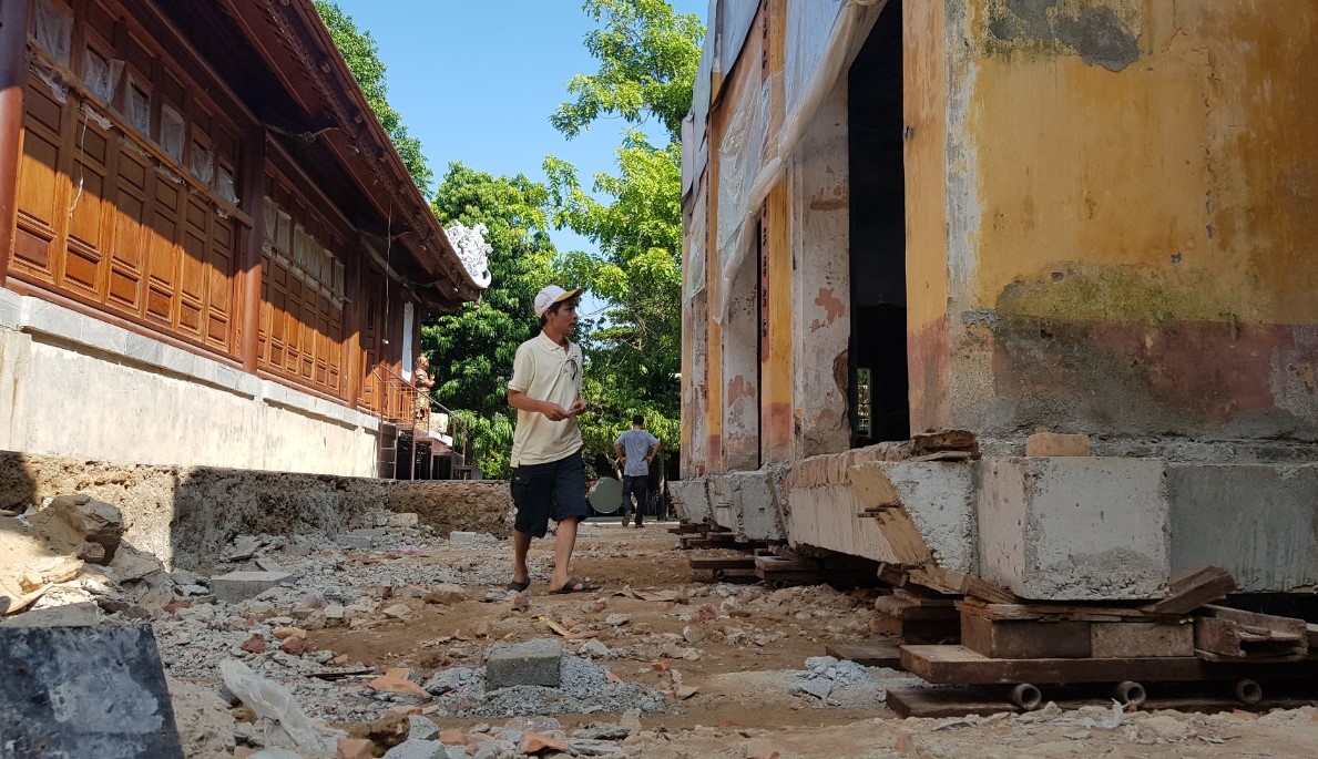 Các công nhân di dời ngôi chánh điện cũ của Quốc tự Diệu Đế