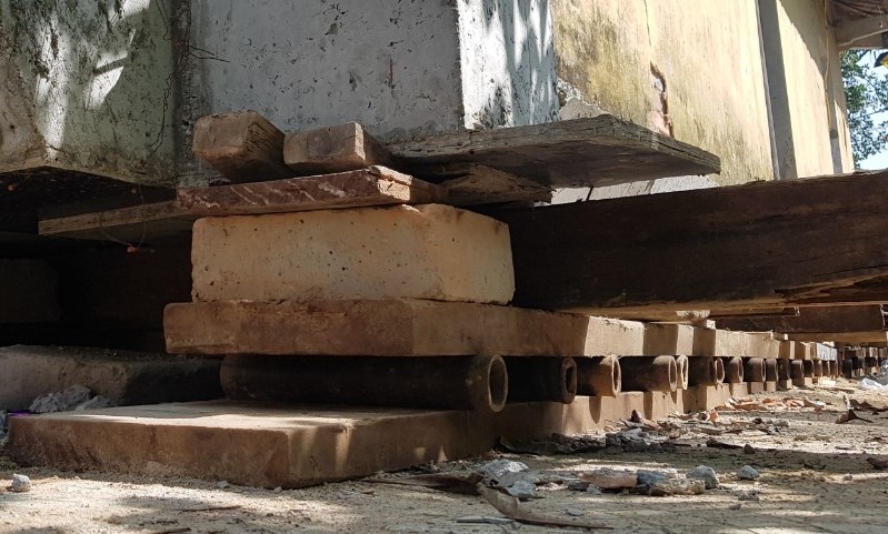 Hệ thống ván gỗ và con lăn được đưa vào bên dưới hệ đà để di chuyển toàn bộ ngôi chánh điện cũ