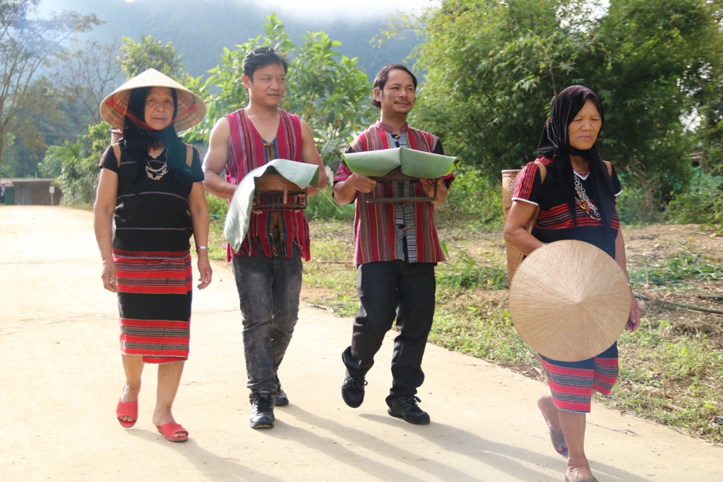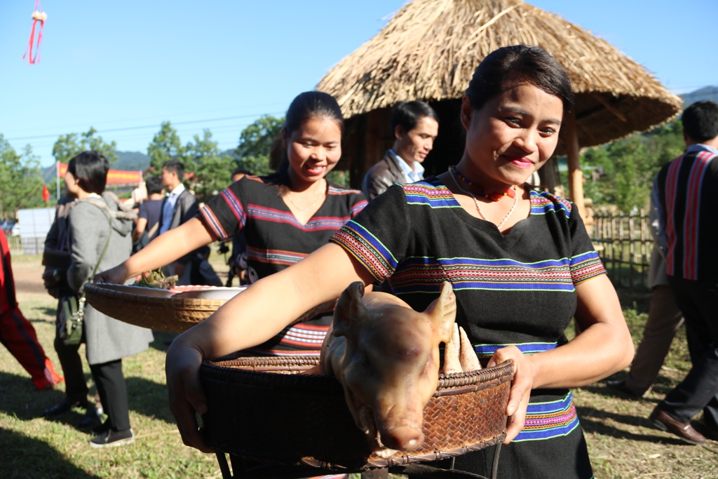 Người dân đem lễ vật đến nhà cộng đồng tổ chức lễ hội Aza Koonh