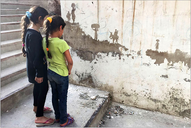 Hai bé gái ngắm nhìn bức tranh trên bức tường cũ của nghệ sĩ Pejac. Ảnh: PressTV