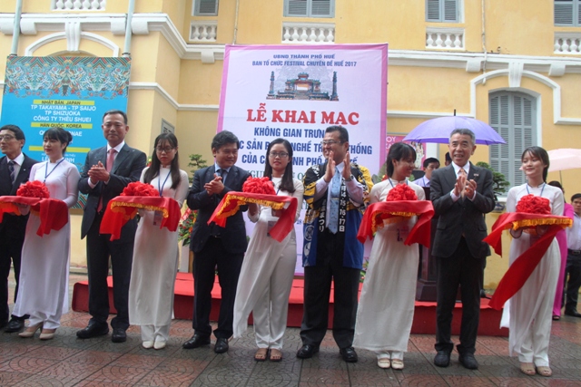Đại diện các thành phố quốc tế cùng BTC Festival Nghề truyền thống Huế 217 cắt băng khai trương không gian trưng bày