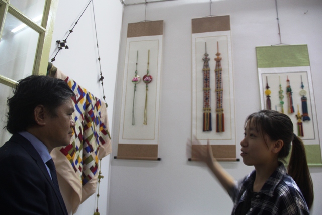 Một tình nguyện viên đang thuyết trình về các sản phẩm do các thành phố quốc tế đem đến trưng bày với ông Nguyễn Văn Thành, Chủ tịch UBND TP. Huế, Trưởng BTC Festival Nghề truyền thống Huế 2017