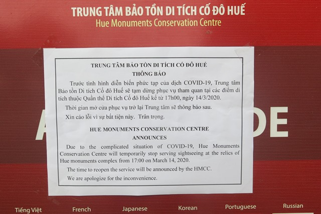 Trên màn hình led trước quầy vé và trước cổng vào Đại Nội, Trung tâm Bảo tồn Di tích Cố đô Huế thông báo bằng tiếng Việt và tiếng Anh: “Trước tình hình diễn biến phức tạp của dịch COVID-19, Trung tâm Bảo tồn Di tích Cố đô Huế sẽ tạm dừng phục vụ tham quan tại các điểm di tích thuộc Quần thể Di tích Cố đô Huế kể từ 17h ngày 14/3. Thời gian mở cửa phục vụ trở lại trung tâm sẽ thông báo sau. Xin cáo lỗi vì sự bất tiện này”. Ở quầy vé, vẫn có nhân viên túc trực để hỗ trợ khách trả lại vé.