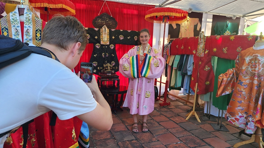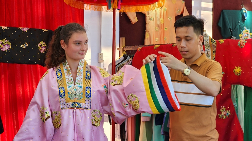 HNN.VN - Nhiều du khách nước ngoài tỏ ra thích thú, hào hứng khi được trải nghiệm may đo, thử những bộ áo dài truyền thống Việt Nam tại không gian trưng bày các sản phẩm áo dài và phụ kiện liên quan ở không gian Quốc Tử Giám.