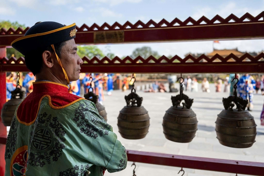 Trong buổi sáng mùa xuân nắng nhẹ, sân Đại triều rộn ràng vang lên âm thanh nhạc lễ cung đình. Đoàn nghi trượng, quan văn, quan võ trong trang phục triều phục truyền thống lần lượt tiến vào vị trí theo đúng thứ bậc phẩm cấp, tái hiện khung cảnh trang nghiêm của một buổi thiết Đại triều đầu năm mới dưới Triều Nguyễn.