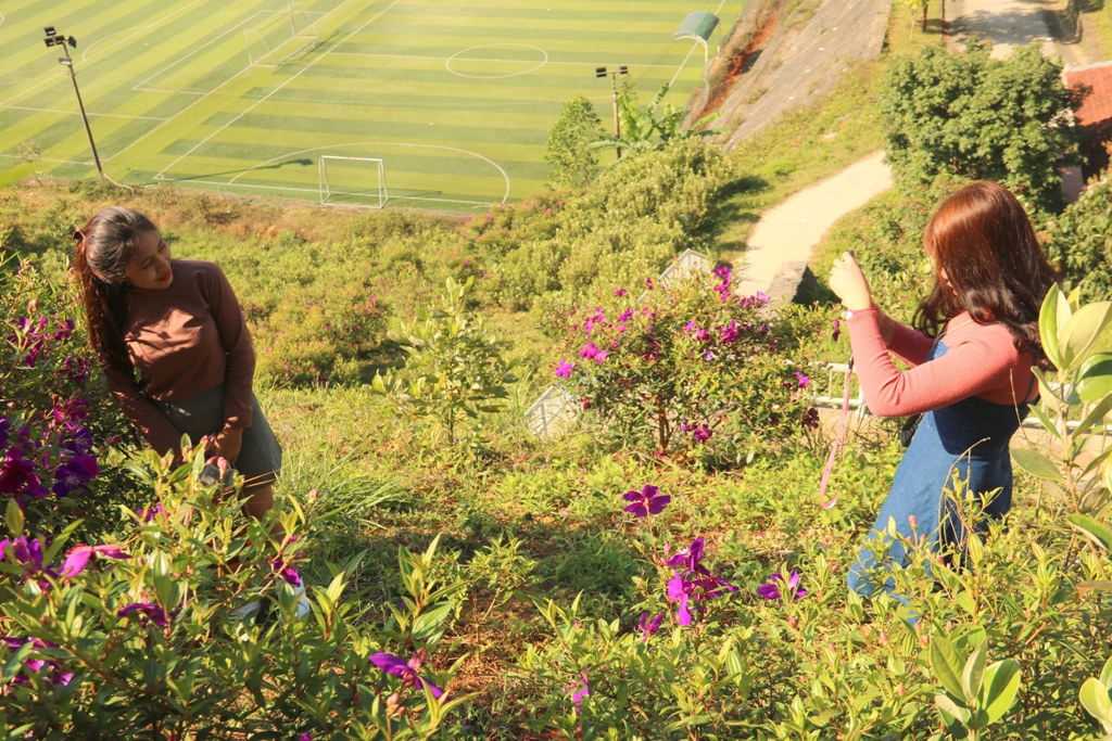 Bạn trẻ chụp ảnh tết với hoa sim, hoa mua ở khu vực đồi thông A Lưới