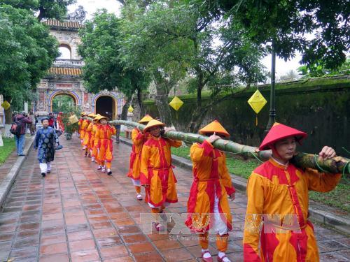 Rước nêu từ cửa Hiển Nhơn vào Thế Miếu trong lễ dựng nêu. Ảnh: Quốc Việt/TTXVN