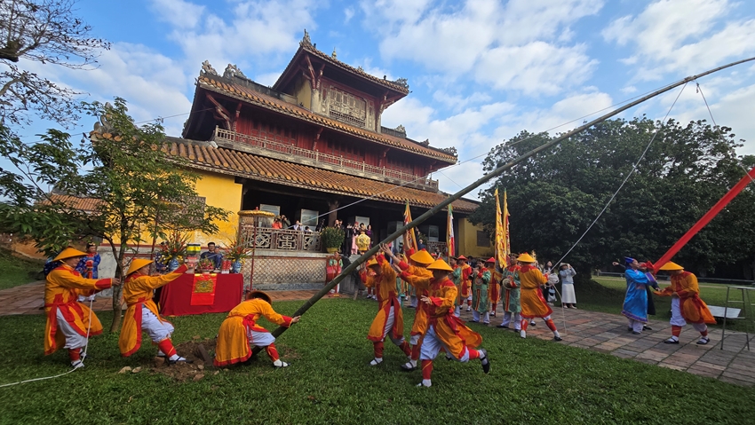 HNN.VN - Sáng 22/1 (23 tháng chạp âm lịch), Trung tâm Bảo tồn Di tích Cố đô Huế đã tái hiện lễ dựng nêu đón Tết bên trong Hoàng cung Huế theo đúng lễ nghi cung đình dưới triều Nguyễn.