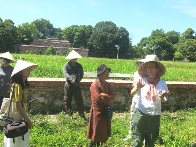Chuyên gia người Đức Andrea Teufel (bìa phải) giới thiệu quá trình bảo tồn, trùng tu các công trình di sản của điện Phụng Tiên