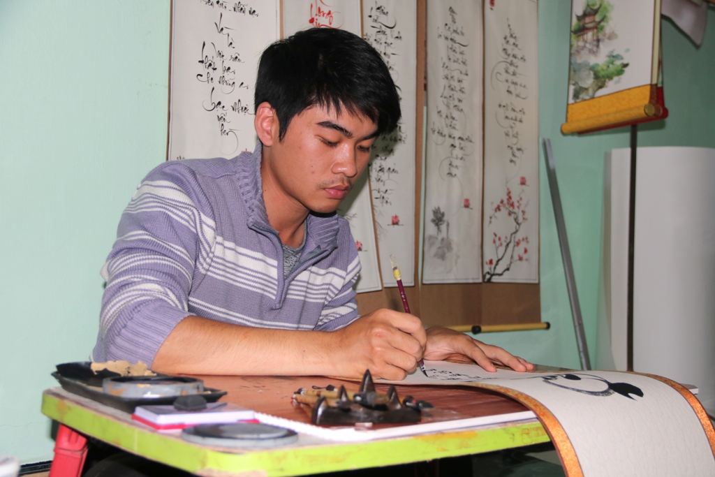 “Người ta thích treo thư pháp ngày tết vì mỗi bức thư pháp chuyển tải một thông điệp hay. Không chỉ người già có thói quen chơi thư pháp mà người trẻ bây giờ cũng rất thích”, ông đồ Nguyễn Tuấn chia sẻ.