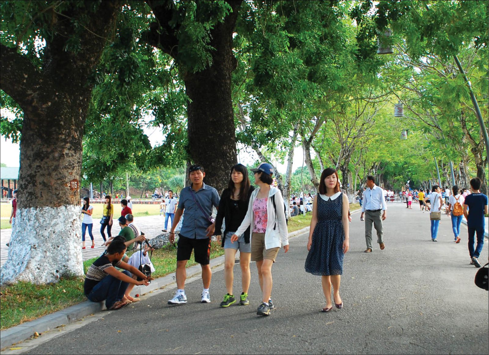 Du khách đi dạo dưới hàng cây ở trước Đại Nội. Ảnh: Ng. Thắng
