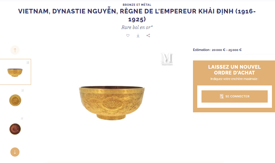 Thông tin đấu giá được hãng đấu giá MILLON (trụ sở chính tại Paris, Pháp) công bố nhiều ngày qua trên trang web chính thức của hãng này. Trong số hơn 300 cổ vật được đưa ra đấu giá, có hai cổ vật nhà Nguyễn: Ấn vàng đúc năm 1823 triều Minh Mạng (1820 - 1841) và một bát vàng triều Khải Định (1917 - 1925).