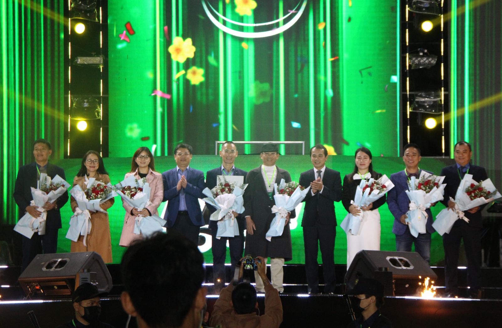 Phó Chủ tịch Thường trực UBND tỉnh Nguyễn Thanh Bình tặng hoa các đơn vị tài trợ Festival Huế trong đêm nhạc hội