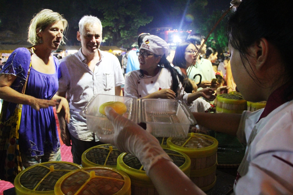 Hai du khách nước ngoài tìm hiểu các món ăn được bày bán tại không gian văn hóa ẩm thực thuần Việt