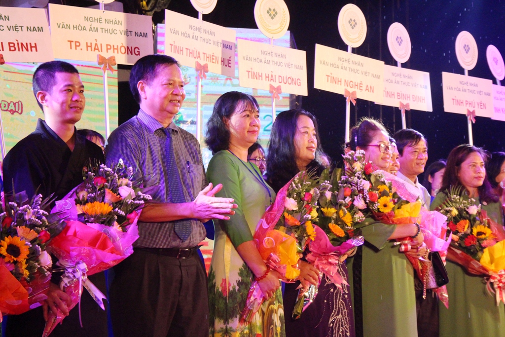 Phó Chủ tịch UBND tỉnh Nguyễn Dung tặng hoa cho đại diện các nghệ nhân ẩm thực đến từ các tỉnh, thành tham dự liên hoan