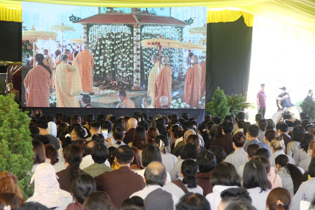 Khi đến Công viên Vĩnh hằng – Vườn Địa đàng, kim quan được đưa đến lò thiêu. Lễ trà tỳ tiến hành vào lúc 9h trước sự chứng kiến của mọi người. Bên ngoài nơi diễn ra lễ trà tỳ, nhiều màn hình lớn được lắp đặt để chiếu trực tiếp đến phục vụ người xem.
