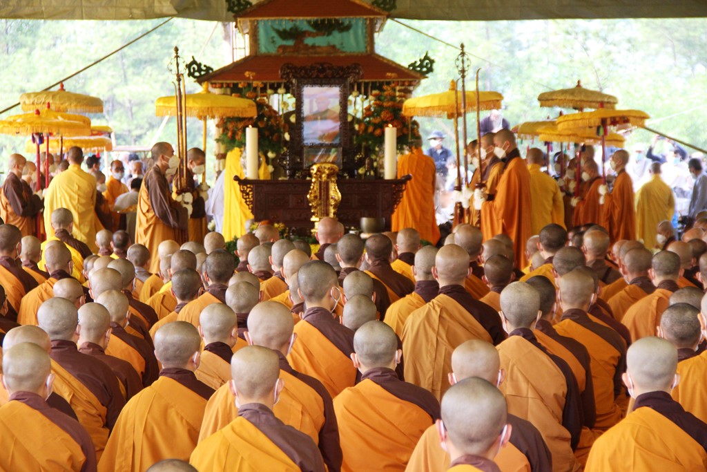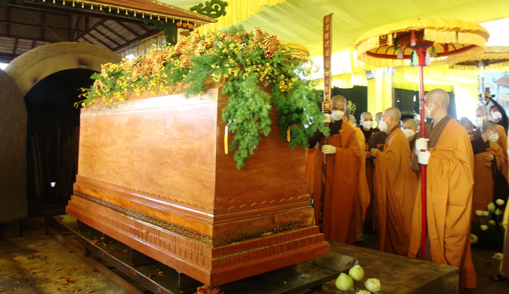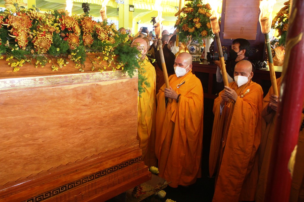 Nghi lễ được thực hiện ngắn gọn trong im lặng của tất cả mọi người dự. Đến khoảng hơn 7h, kim quan được đưa ra khỏi thiền đường Trăng Rằm, để tiến về Công viên Vĩnh hằng - Vườn Địa đàng - nơi làm lễ Trà Tỳ. Hàng dài tăng ni, Phật tử, du khách và người dân đi theo sau kim quan trong suốt hành trình dài hơn 7km.