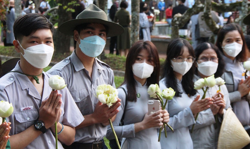 Một nhóm các Phật tử trên tay cầm hoa sen trắng dự lễ