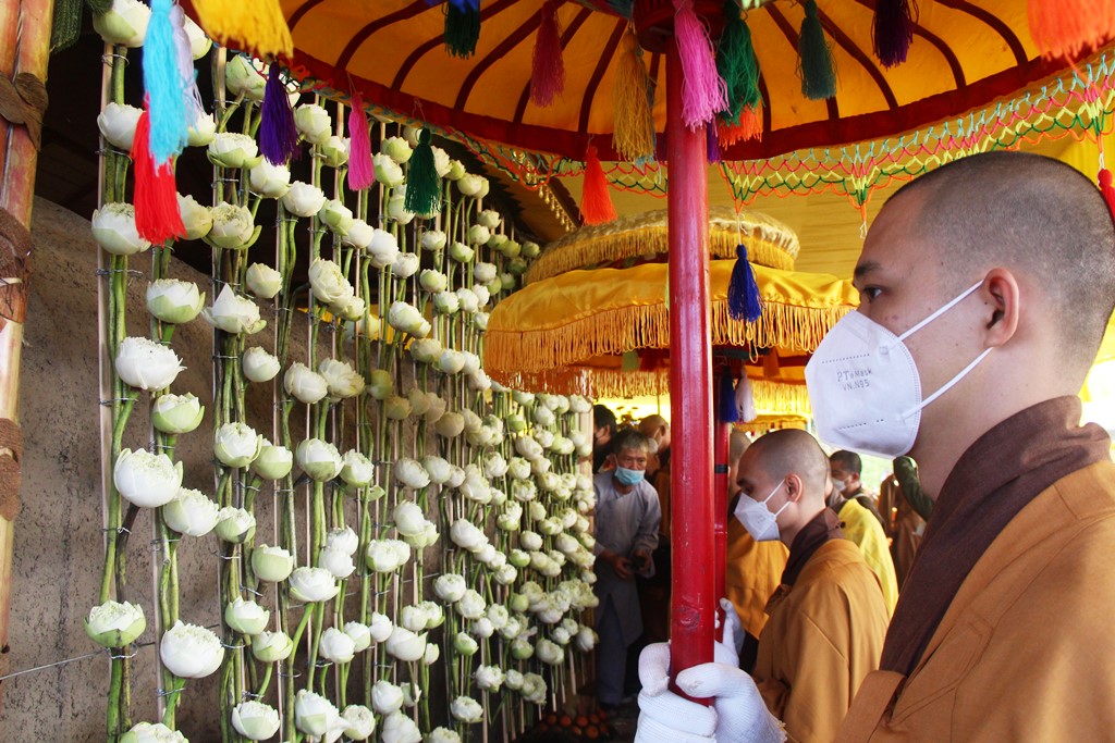 Quanh lò thiêu nơi Trà Tỳ kết nhiều hoa sen trắng để tưởng niệm thiền sư