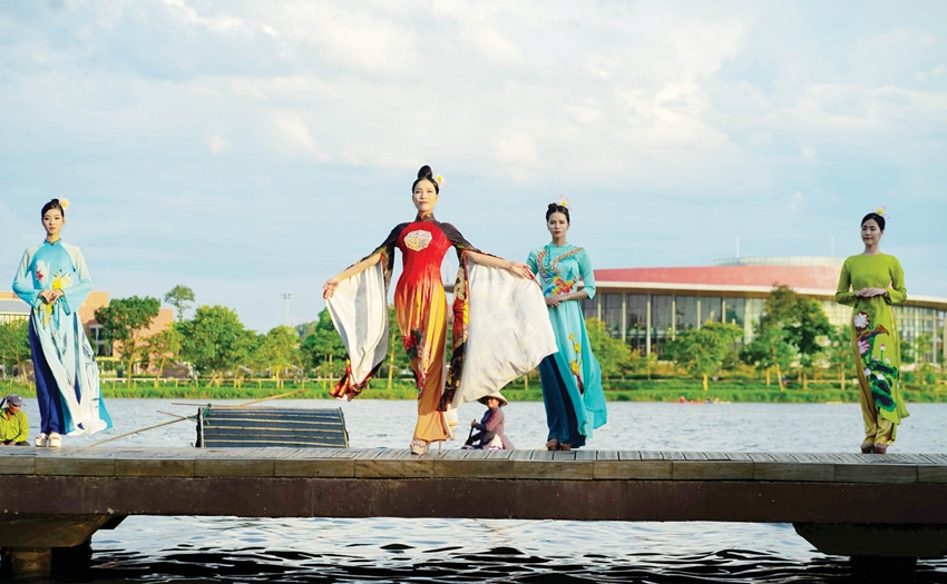 | Một chương trình biểu diễn áo dài ở khu vực cầu bán nguyệt dọc theo bờ sông Hương. Ảnh: Sở VH-TT |