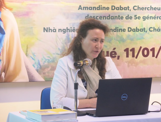 HNN.VN - Tiếp tục chuỗi hoạt động trong chuyến sang thăm và làm việc tại Huế, chiều 11/1, TS. Amandine Dabat, nhà nghiên cứu lịch sử nghệ thuật, hậu duệ đời thứ 5 của vua Hàm Nghi đã có buổi nói chuyện với học sinh, sinh viên tại Viện Pháp tại Huế.