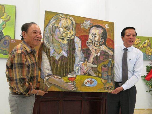 Họa sĩ Nguyễn Đại Giang (trái) trong buổi trao tặng