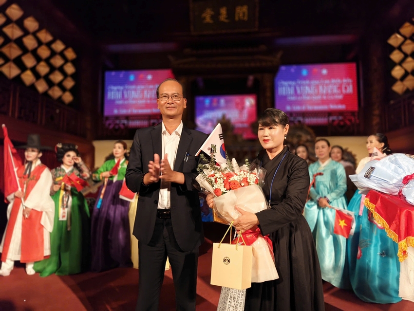 | Lãnh đạo Trung tâm Bảo tồn Di tích Cố đô Huế tặng hoa Hiệp hội Âm nhạc Truyền thống Gyeonggi Hàn Quốc |