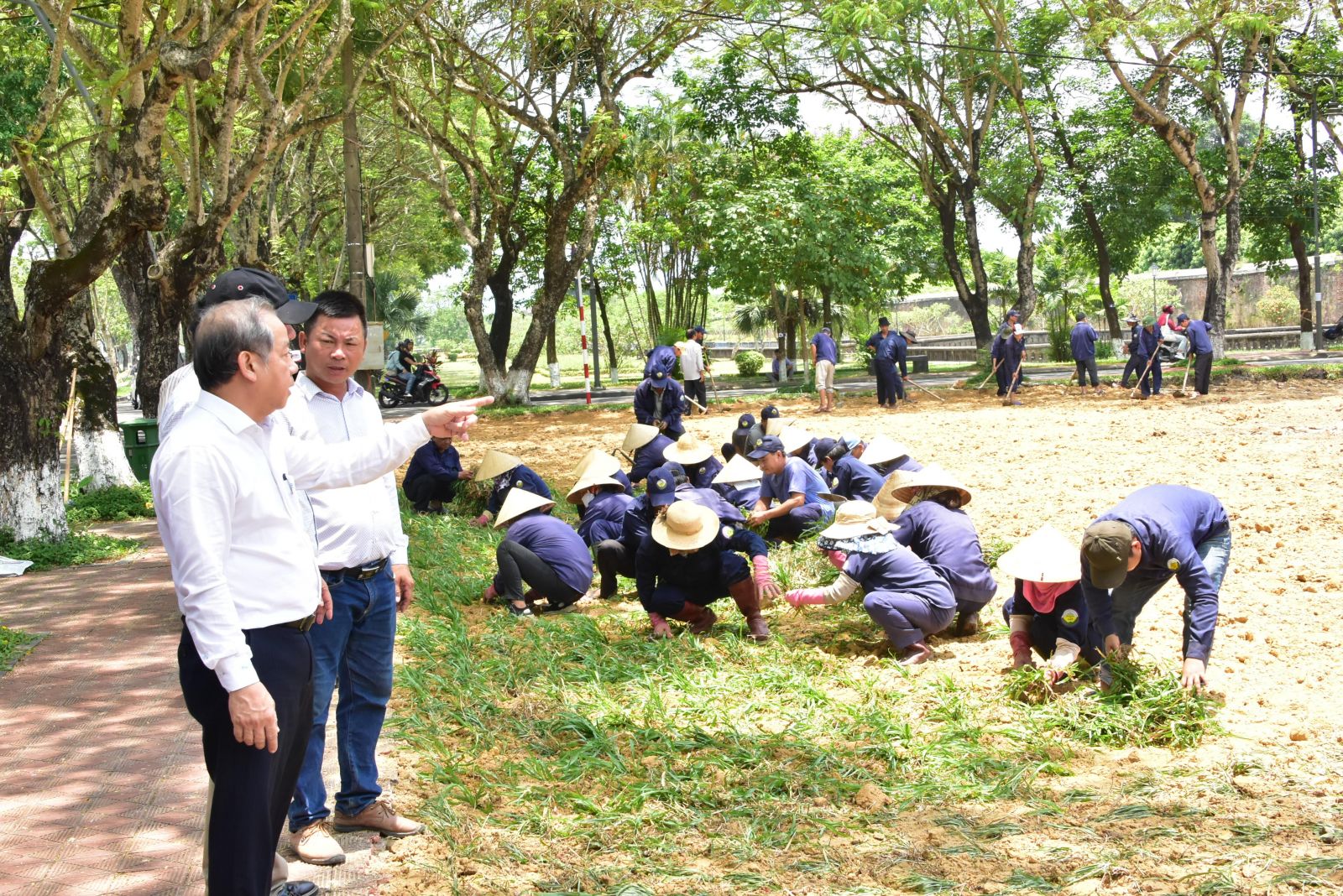 Công nhân Công viên cây xanh đang trồng cỏ tái tạo mặt bằng tại khuôn viên Quốc Tử Giám