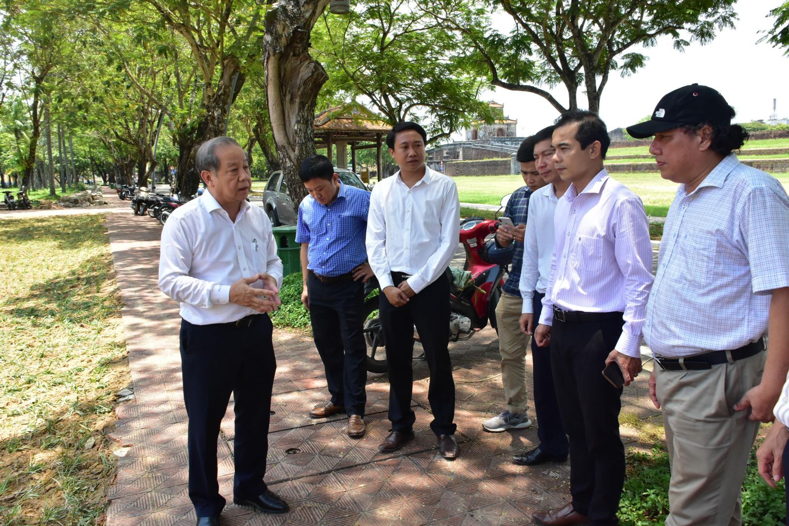 Chủ tịch UBND tỉnh Phan Ngọc Thọ (bìa trái) yêu cầu các đơn vị liên quan sớm chỉnh trang khuôn viên Quốc Tử Giám để nơi đây trở thành nơi giáo dục truyền thống cho thế hệ trẻ