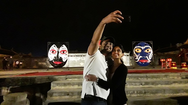 Hai du khách nước ngoài tranh thủ lưu lại kỉ niệm bên trong Đại Nội về đêm
