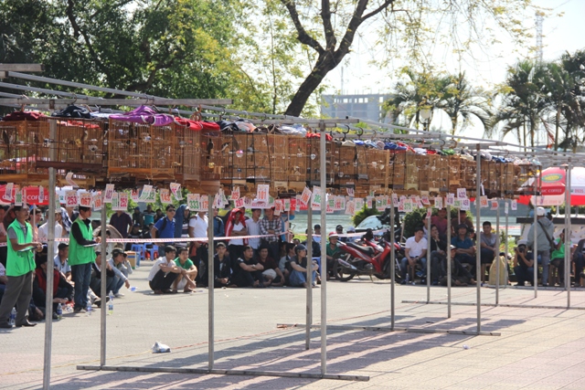 Các chim chào mào dự thi được treo số thứ tự khác nhau để giám khảo chấm