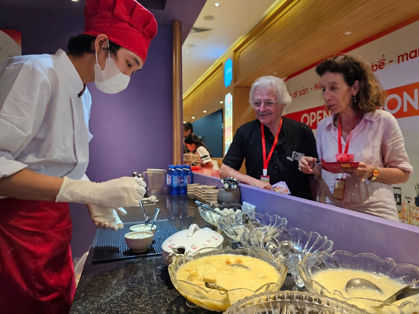 | 2 du khách nước ngoài háo hức chờ được thưởng thức chè Huế |
