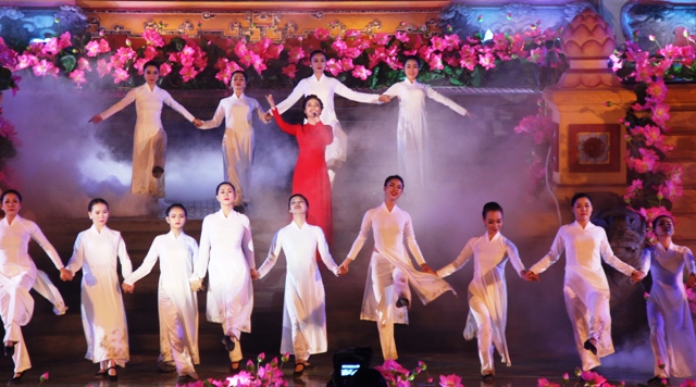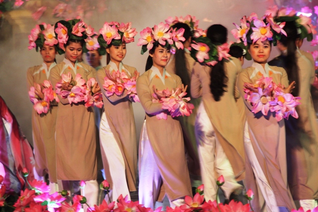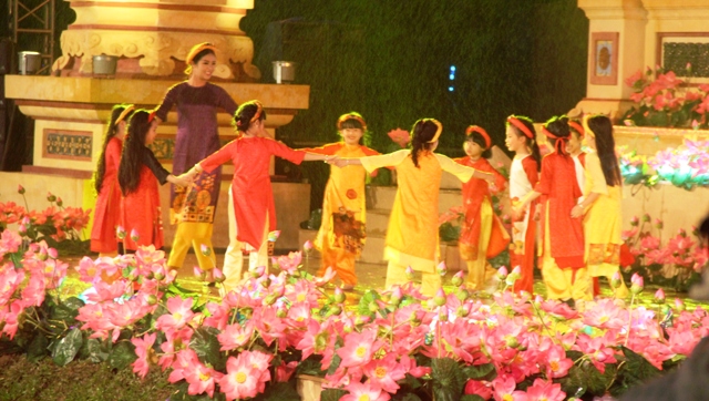 Hoa hậu Ngọc Hân cùng các em thiếu nhi trong trang phục áo dài phụ họa cho một tiết mục trên sân khấu