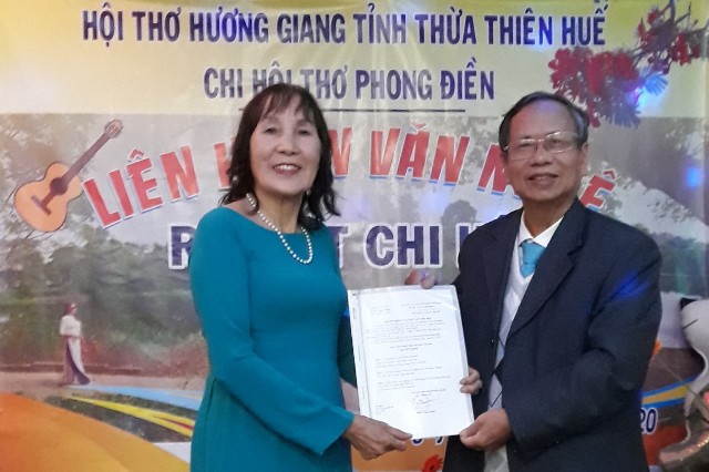 Ông Phan Công Tuyên, Chủ tịch Hội thơ Hương Giang trao quyết định thành lập chi hội thơ Phong Điền