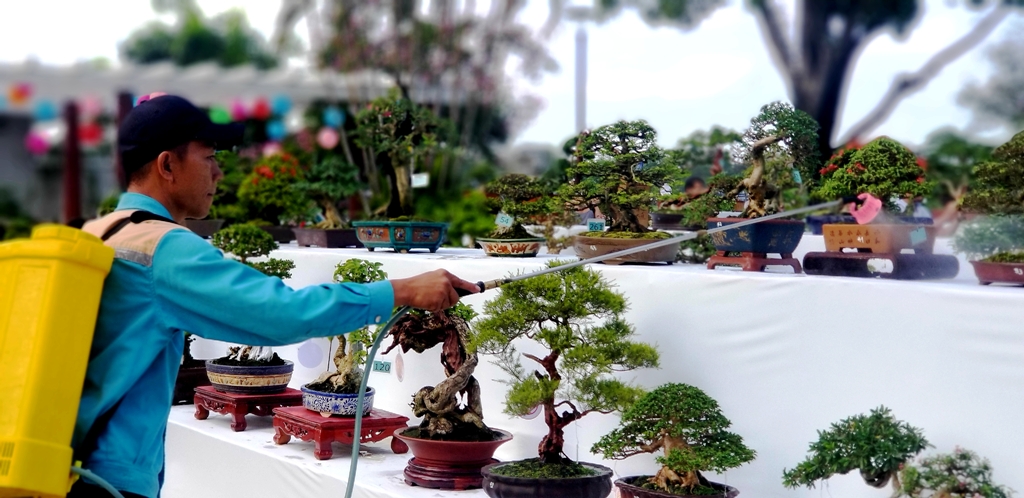 Nhân viên chăm sóc các chậu bonsai để người dân thưởng lãm...