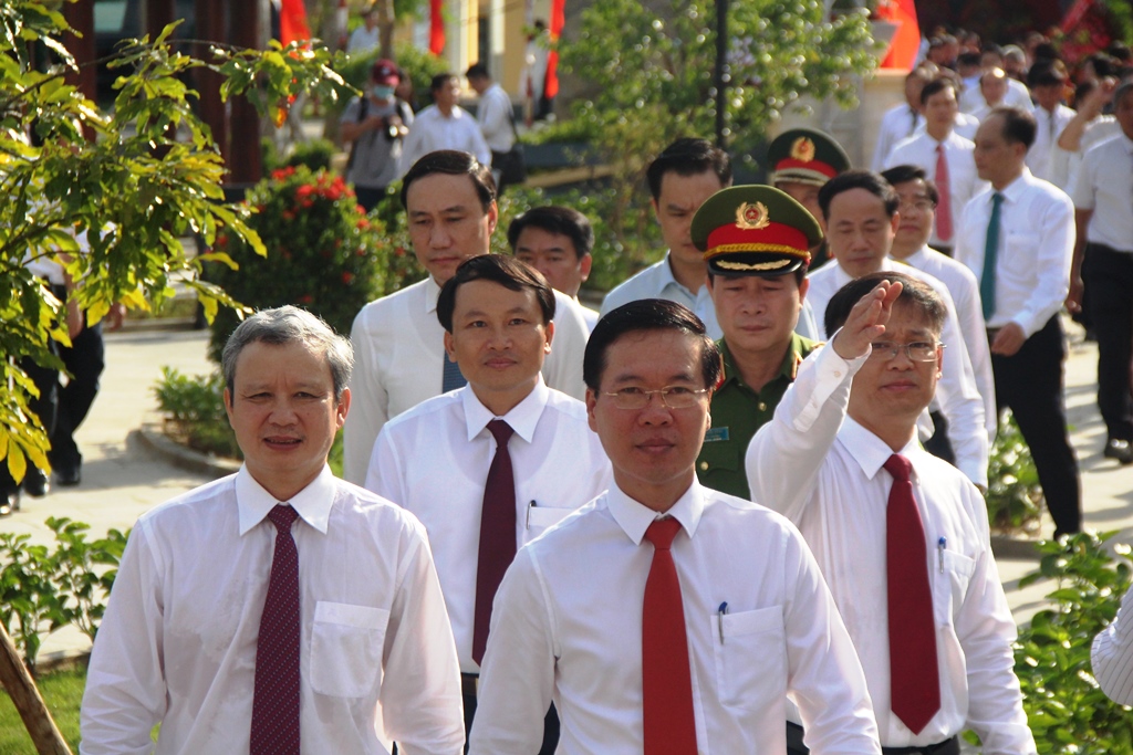 Ủy viên Bộ Chính trị, Trưởng Ban Tuyên giáo Trung ương Võ Văn Thưởng cùng UVTW Đảng, Bí thư Tỉnh uỷ Lê Trường Lưu và đoàn đại biểu tham qua khuôn viên công viên và nhà lưu niệm