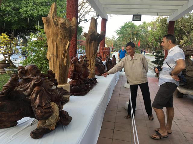 Du khách nước ngoài thích thú ngắm nhìn các loại sinh vật cảnh, điêu khắc gỗ tại Công viên Lý Tự Trọng