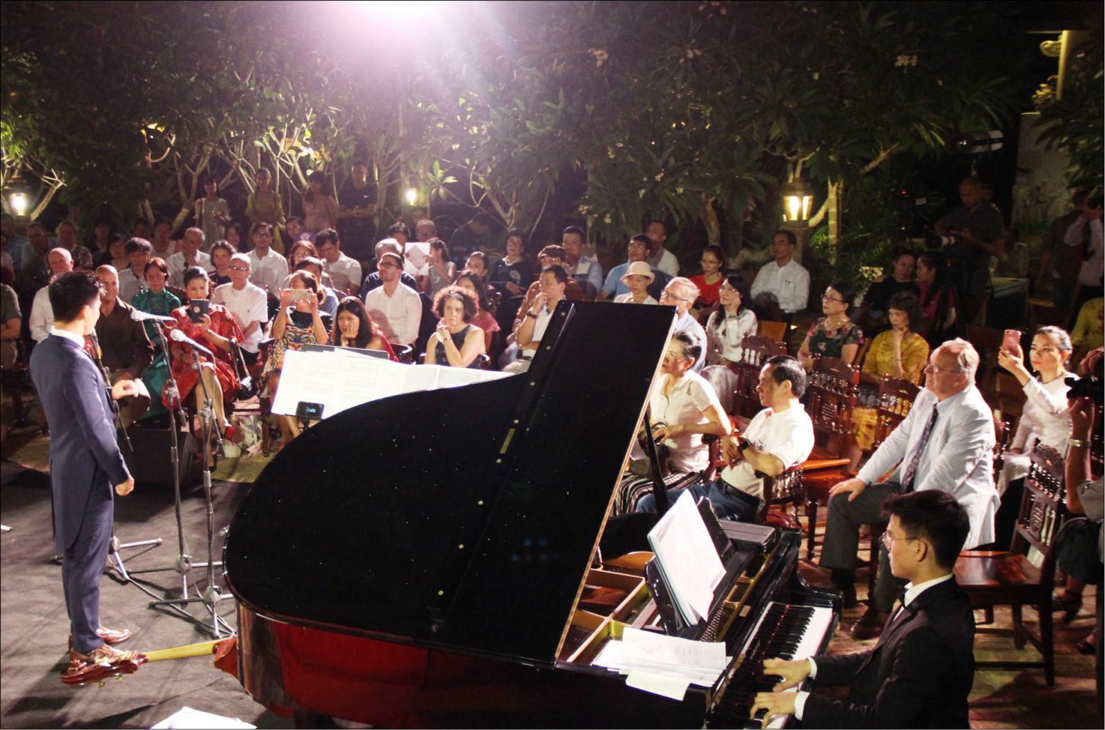 Rất nhiều bè bạn của đôi vợ chồng là những nghệ sĩ từ Nga, Ý…  xa xôi ngay khi nghe ý tưởng đã về Huế để biểu diễn. Tất nhiên, không thể thiếu những nghệ sĩ Huế nặng lòng với vùng đất mình sinh ra, lớn lên. Trong không gian không thể đẹp hơn, khoảnh sân bán nguyệt tựa vào ngôi nhà rường truyền thống hướng mặt ra sông Hương trở thành một sân khấu để mọi người có thể trình diễn và thưởng thức. Những giai điệu âm nhạc truyền thống cứ thế xen lẫn với một vài tiết mục hòa nhạc Tây phương đưa người nghe chìm vào cảm xúc ngây ngất.