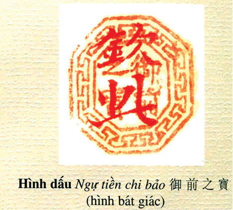 “Nói có sách, mách có chứng”, xem hình chụp ở trang 212; đó là con dấu “Nà Bôn thổ châu đồ ký” tại vùng dân tộc thiểu số thời vua Hàm Nghi (năm 1886) trong văn bản do Hiệp quản cơ Định Man Lê Văn Lộc tâu khai thời gian, địa điểm vua Hàm Nghi đi qua. Tất nhiên là những ấn chương của nhà vua thuộc hàng “quốc bảo” thì hiện diện ở rất nhiều trang sách, với rất nhiều cấp độ khác nhau. Xin giới thiệu hai ấn chương thuộc hàng quốc bảo in ở trang 24: “Ngự tiền chi bảo” hình bầu dục, được đúc bằng vàng thời vua Gia Long; còn hình bát giác, cũng là “Ngự tiền chi bảo”, nhưng đúc thời vua Đồng Khánh (nguyên do năm 1885, Tôn Thất Thuyết đưa vua Hàm Nghi rời khỏi kinh thành mang theo bảo ấn đi, nên vua Đồng Khánh cho đúc lại bằng ngà voi, hình bát giác, vì nếu “theo mẫu cũ, e có sự ngại khác” - “Đại Nam thực lục” đã ghi rõ như vậy.)