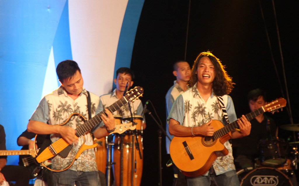 Màn trình diễn ghita của hai bạn trẻ với giai điệu sôi động cùng vùng biển Lăng Cô