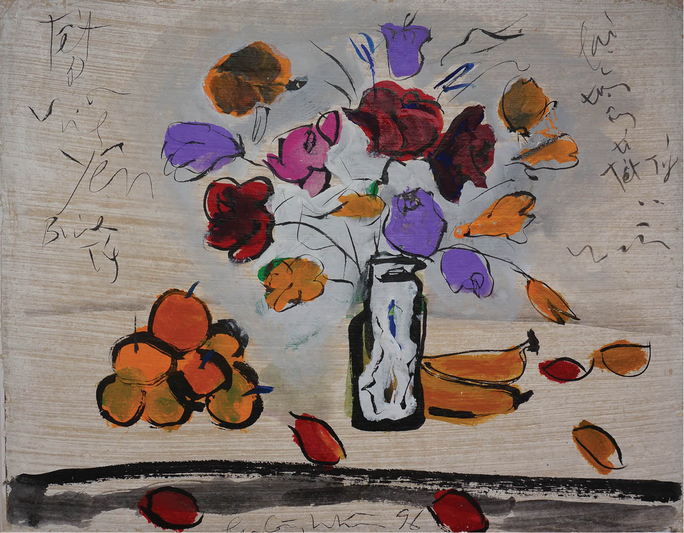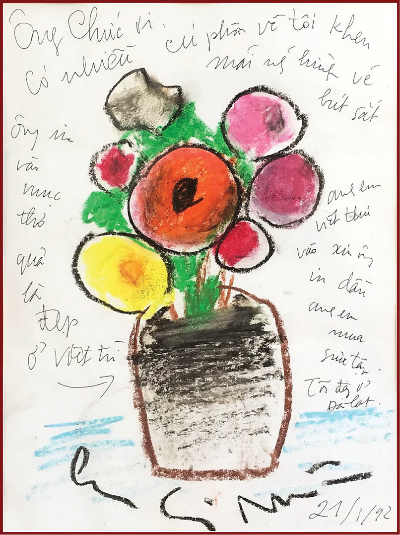 Tôi thường đến thăm ông ở ngôi nhà đó khi có dịp lên thành phố dốc đồi, đến trước cái cổng sắt rợp bóng giàn hoa giấy nhiều màu tím - đỏ - hồng - trắng, nhấn chuông và chờ ông chậm chạp bước ra mở cửa. Trong nhà, tranh hoa ở khắp nơi. Những hoa loa kèn trắng muốt sang cả. Những đóa hồng vàng kiêu hãnh. Những bình lay-ơn đỏ tươi trang trọng. Những cụm cúc tím mộng mơ và đám dã quỳ vàng rực phong trần. Có cả những bông hoa chỉ ở trong thế giới tưởng tượng vô tận của người nghệ sĩ… Trong phòng vẽ của của ông, nơi khung cửa sổ mở ra một mảng Đà Lạt đẹp đến nghẹt thở, có vài bình hoa còn tươi hay đã héo khô được dùng làm mẫu. Tôi còn nhận được quà tặng của ông là những tranh hoa tết vẽ từ thành phố ngàn hoa ấy cho đến lúc ông không còn cầm nổi cọ vẽ nữa… Bức tranh hoa cuối cùng ông gửi tôi là vào dịp Tết Đinh Hợi 2007, với dòng chữ đã ngả nghiêng: “Thân tặng Chức, những ngày ốm đau”.