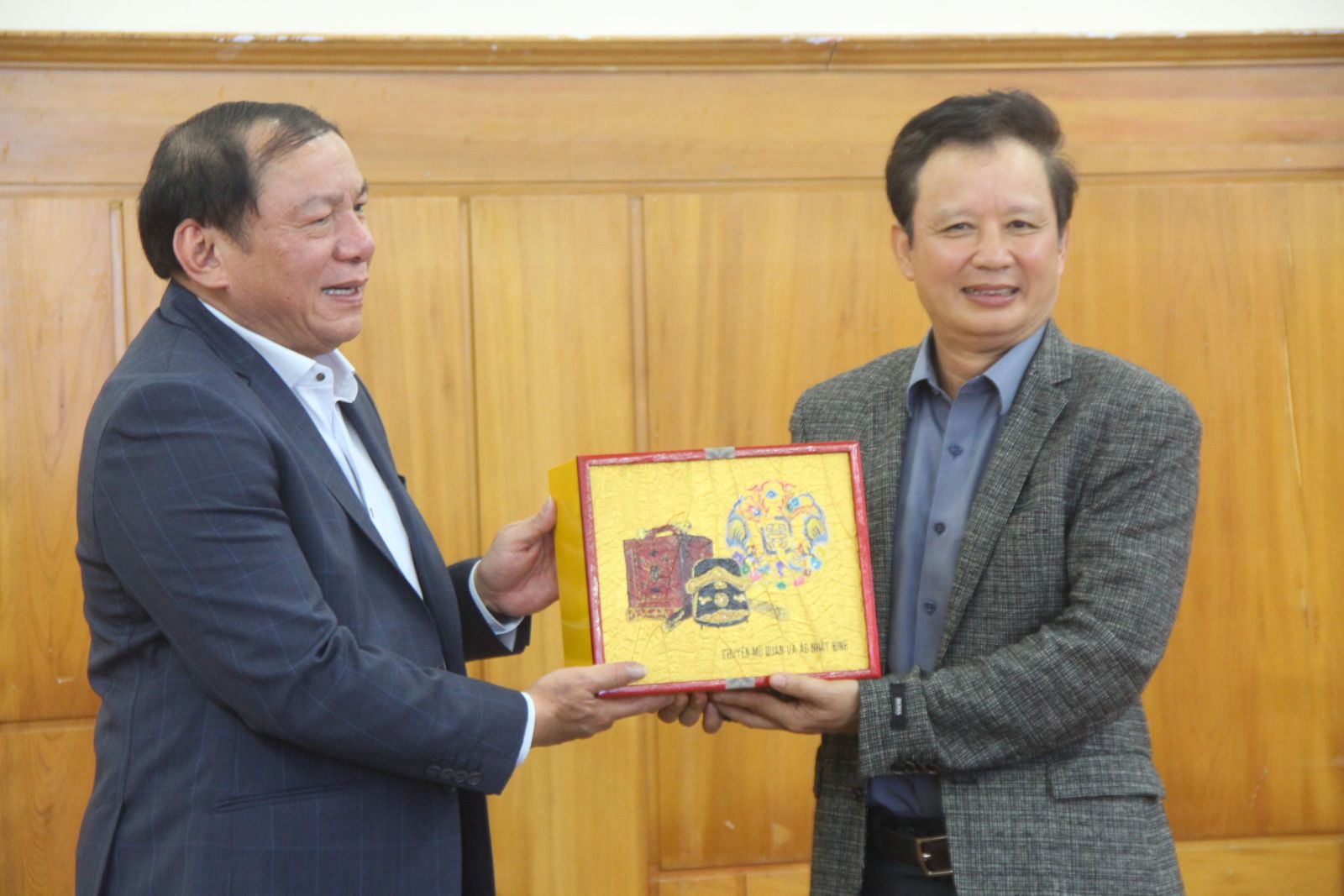 Bí thư Tỉnh ủy Lê Trường Lưu tặng quà lưu niệm cho Bộ trưởng Nguyễn Văn Hùng