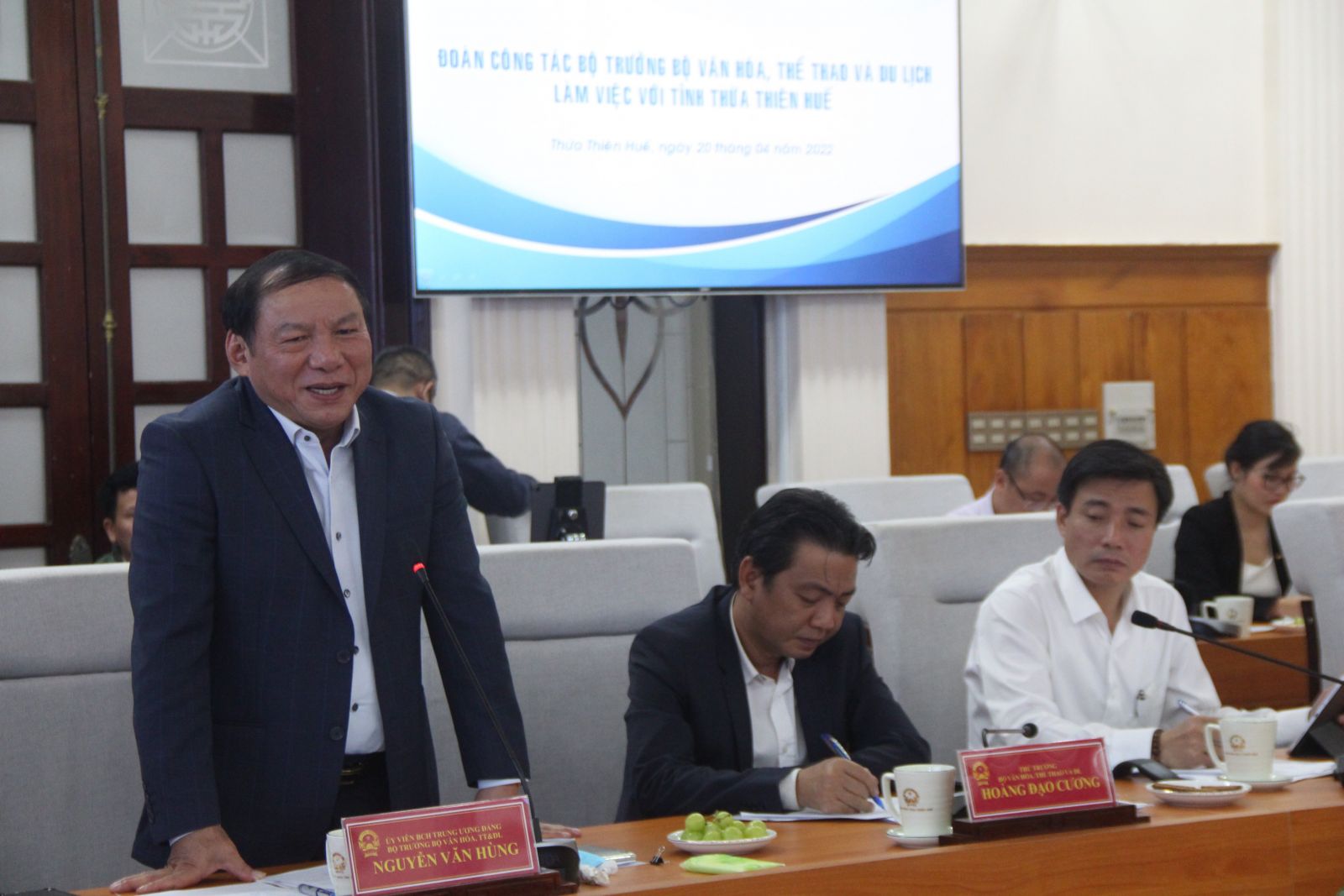 Bộ trưởng Bộ VHTT&DL Nguyễn Văn Hùng đánh giá cao những kết quả mà tỉnh đã đạt được thời gian qua. Đặc biệt, tỉnh đã định hình, làm rõ được 4 trụ cột lớn để phát triển. Đó là tập trung bảo vệ tôn tạo các di tích, di sản, phát huy giá trị văn hóa Huế; ưu tiên phát triển du lịch; hướng đến một nền công nghiệp và công nghệ thông tin theo hướng chất lượng cao; phát triển nông nghiệp công nghệ cao.