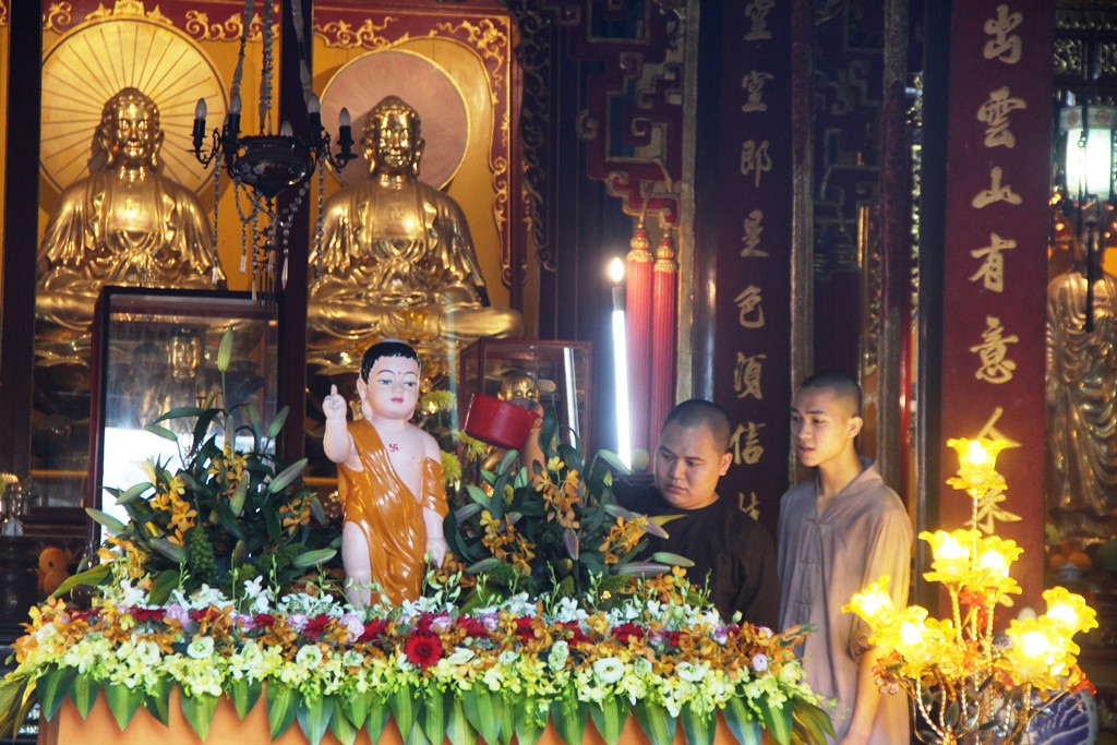 Người dân đến chùa lễ Phật và thực hiện nghi thức tắm Phật
