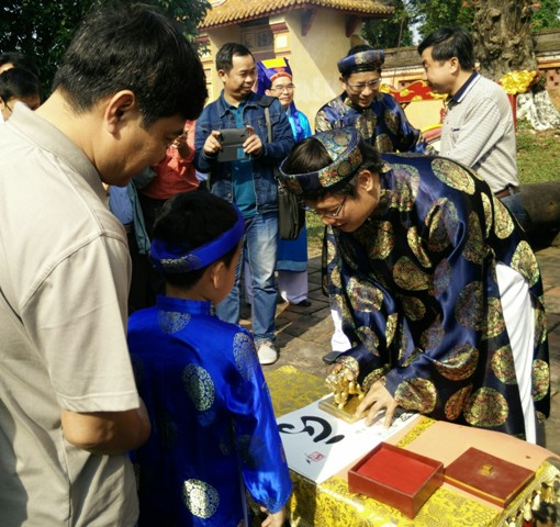 Tiến sĩ Phan Thanh Hải – Giám đốc Trung tâm BTDTCĐ Huế dùng ngọc ấn đóng vào các tờ giấy có ghi các chữ như: Phúc, Lộc, Đạt, Tâm, Tiến… tặng cho du khách với mong muốn nhiều điều tốt đẹp, may mắn sẽ đến với mọi người trong năm mới Bính Thân này.