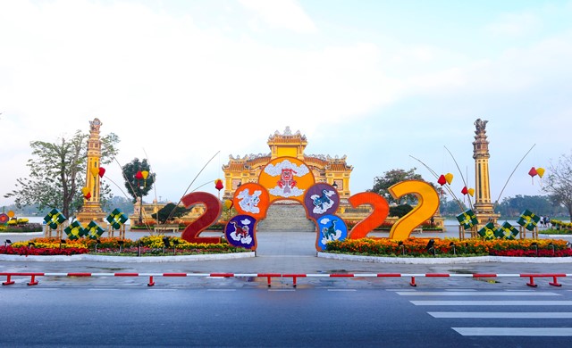 Tiêu biểu là hình ảnh cổng chào tại khu vực Bia Quốc Học được lấy cảm hứng từ mũ tuồng cổ của Huế, màu sắc được phối theo hệ màu trong hệ ngũ sắc. Một điểm độc đáo là linh vật hổ không chỉ thể hiện đây là loài vật biểu trưng cho năm 2022 mà còn gợi nhắc đến giống hổ oai phong trong các bức họa dân gian Việt.