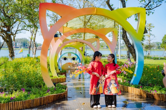 Khu vực Bia Quốc Học được lấy cảm hứng từ không khí lễ hội xuân tưng bừng tại xứ Huế, đặc biệt là lễ hội đua thuyền hằng năm, mang đến màu sắc xuân tưng bừng, náo nhiệt với những nét văn hóa cổ truyền bao trùm.